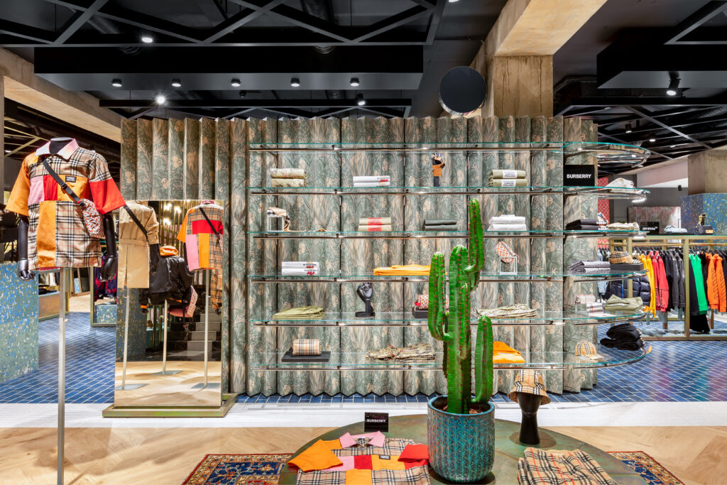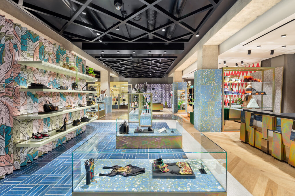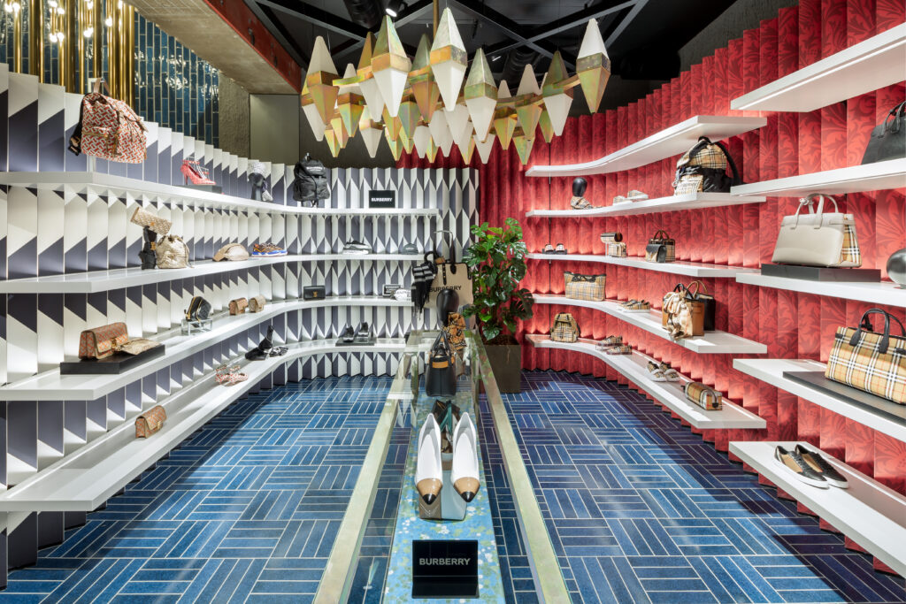 These are ceramic tiles in 2 sizes 9.3×18.6 and 7×29.5 cm used in different areas of the store with an alternating cobalt blue shade and at the same time a “drip” effect, entirely handmade to emphasize the craftsmanship of the product. The 7×29,5 tile was also used to cover the wall along the stairs of the store.